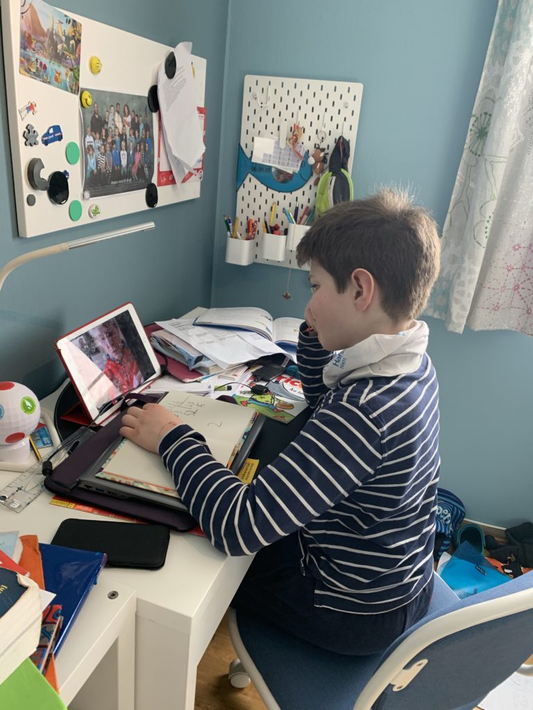 On alterne entre jeux et école à la maison. Les parents jonglent avec les réunions par vidéo.
