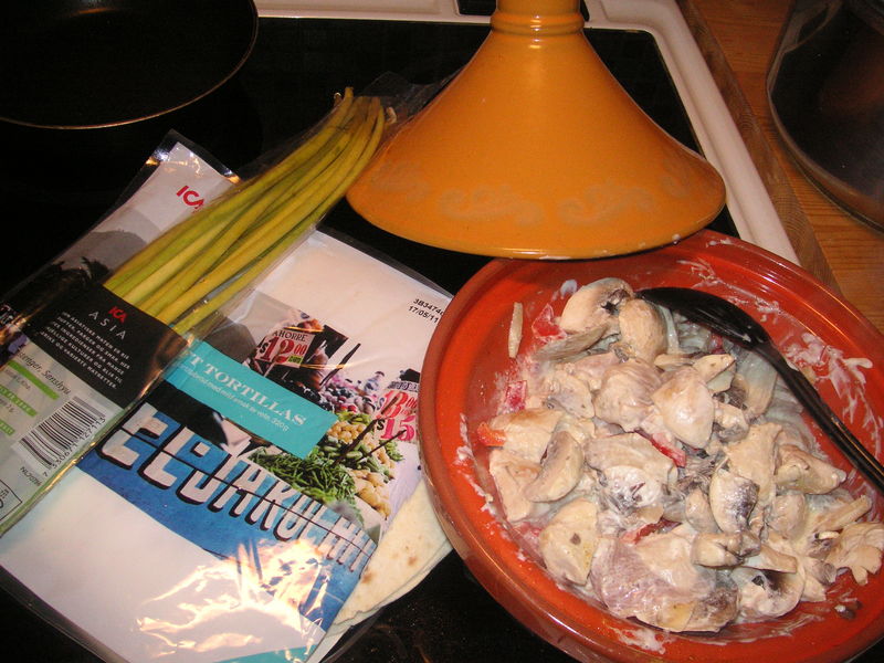 dans un wok ou un plat à tajine faites revenir des morceaux de poulets, puis 1/2 poivron et 4 gros champignons,