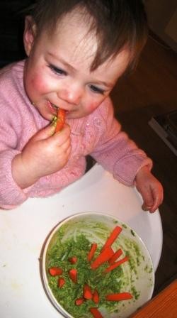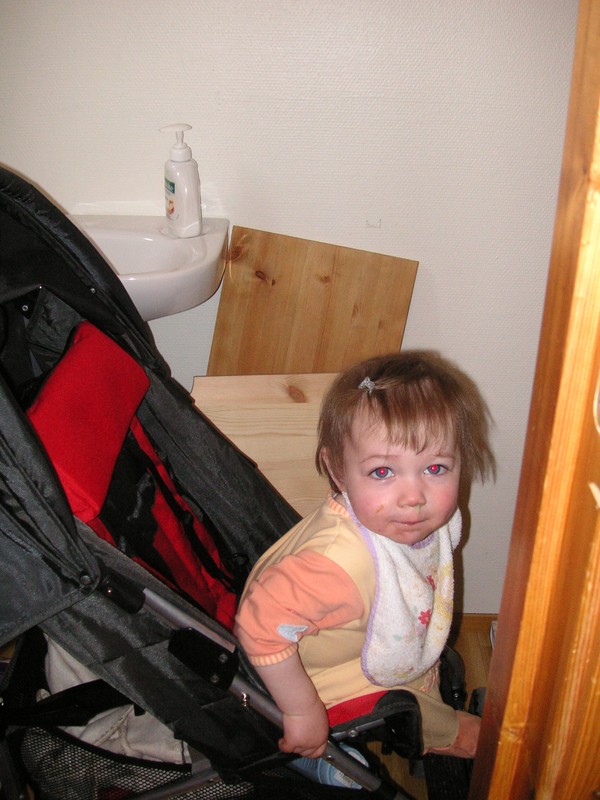 « takk » (merci en Norvegien) qu’elle utilise aussi pour « donne » et « tiens ».Du coup qu’on a a peine sortie un coin de la boite de cornichons et qu’elle a deja dit « merci » qui pourrait lui dire non, hein qui ???
