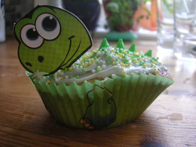 et tous ensembles on a préparé et décoré des muffins dinosaures…au chocolat…trop bons…apparemment