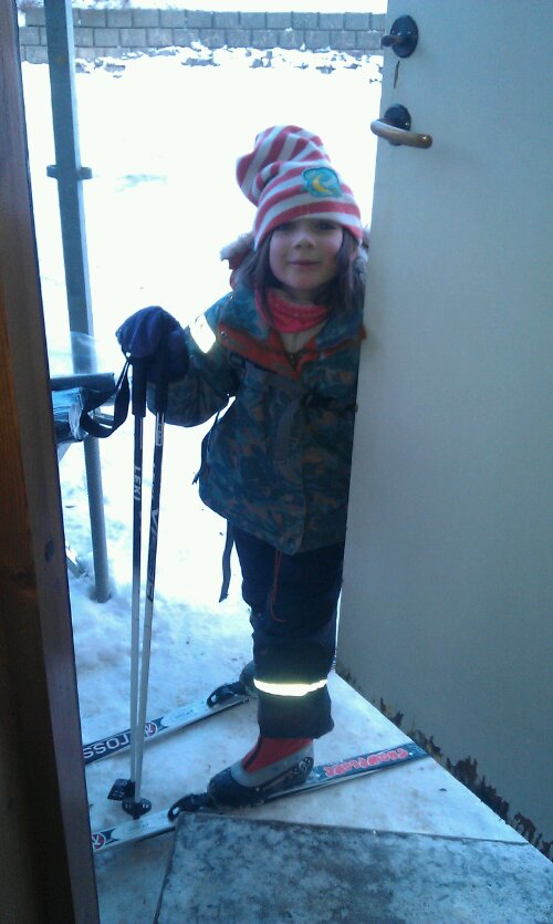 SystèmeD pour Sarah. Elle était en sortie ski avec l’école hier alors pour éviter de porter tout son équipement sur le chemin du retour, elle a skié jusqu’à la maison. Championne et hilare!
