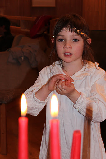 Comme c’était proche de la sainte Lucie et que Sarah étant grande, ne le fêterait plus à l’école, elle a eu le droit de porter son vêtement et de nous chanter une très belle chanson « nous allumons les lumières ». vidéo dispo!